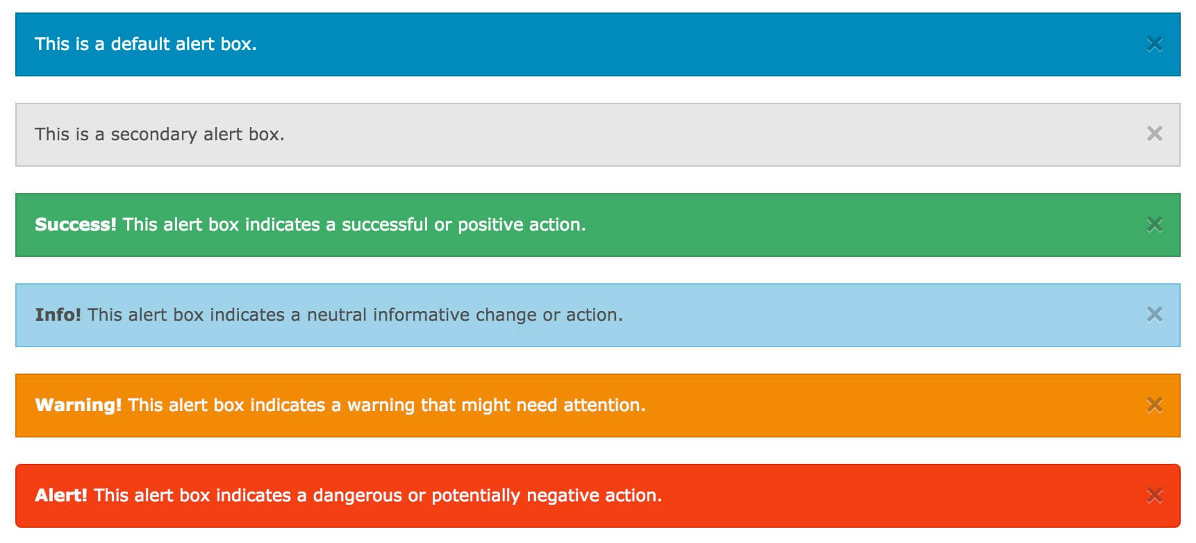 提醒框可以使用 .alert-box 类创建, 可以添加可选的类: .secondary, .success, .info, .warning